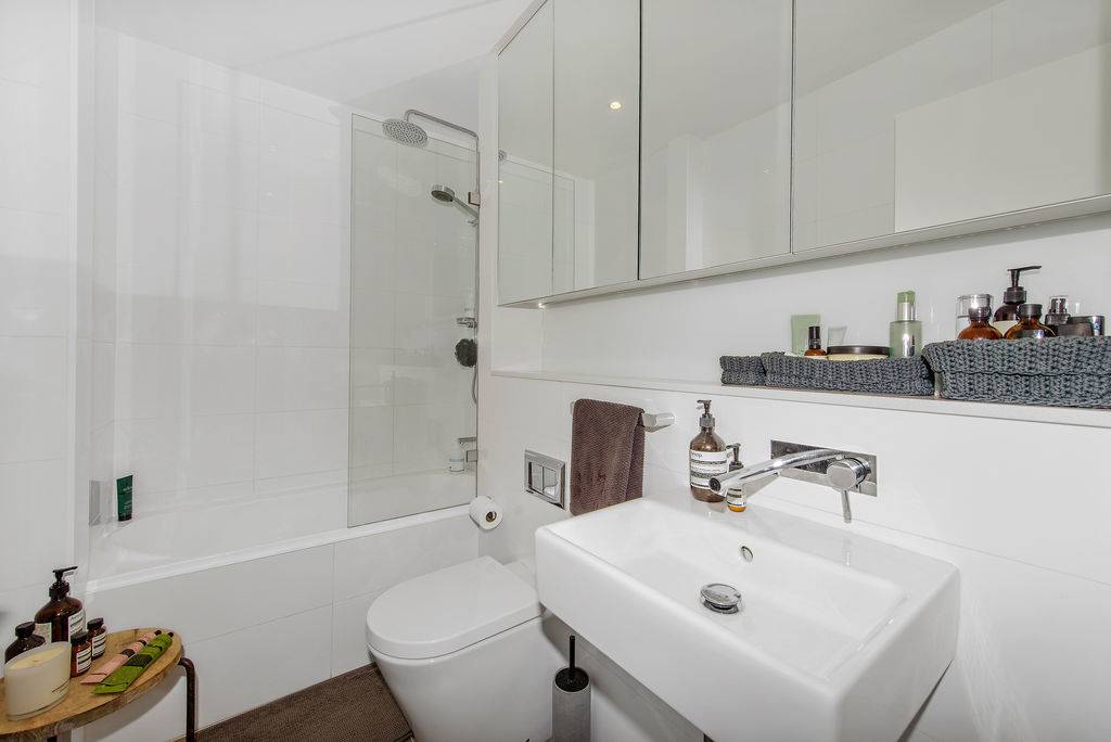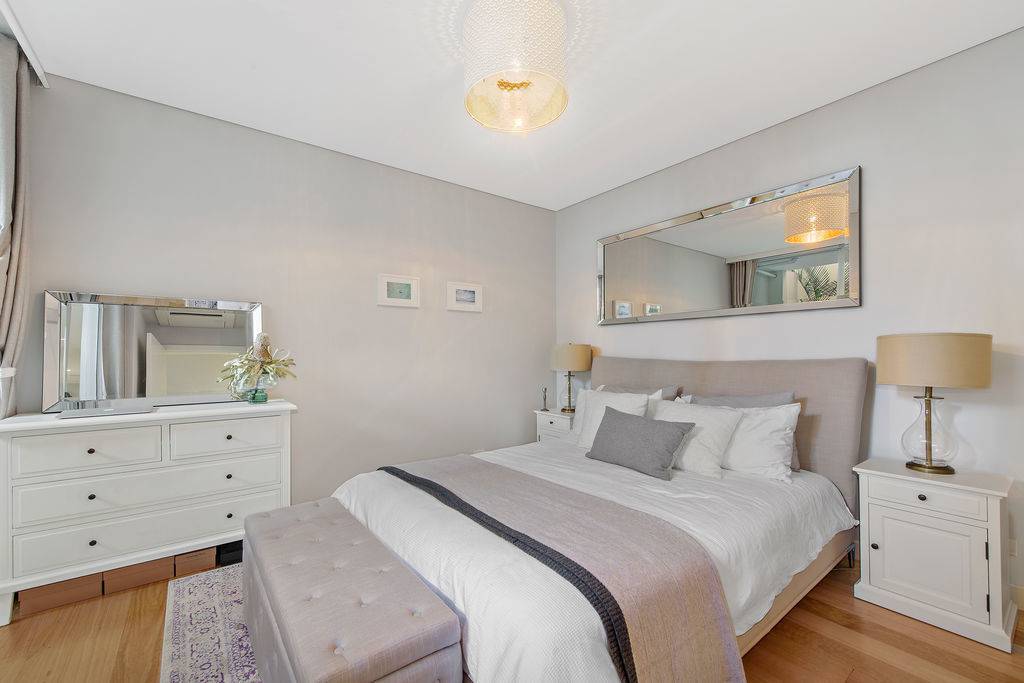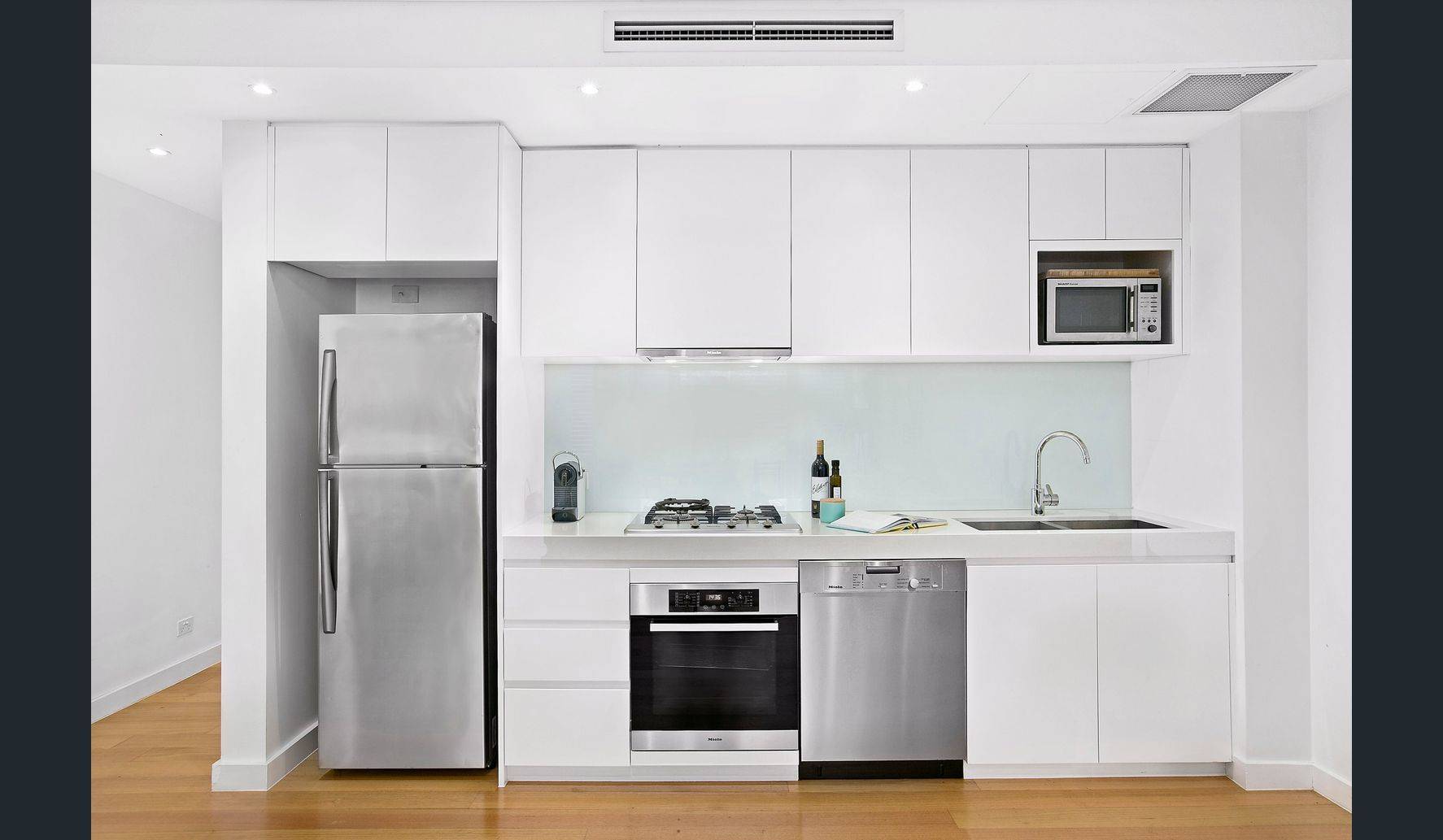 A high-spec gas kitchen is well appointed with stainless steel Miele appliances and a Caesar Stone bench top, while the modern bathroom is tiled floor-to-ceiling and presents a combined shower and bath. Other features of this unmissable property include ducted air conditioning, an internal laundry and underground security parking.